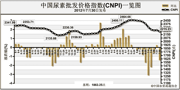 上周(7月23日-7月27日)国内尿素市场需求下滑,价格下跌。7月30日CNPI为2215.23点,环比下跌32.62点,跌幅为1.45%;同比下跌126.76点,跌幅为5.41%;比基期上涨351.98点,涨幅为18.89%。CNPI保持短暂稳定后继续下滑。