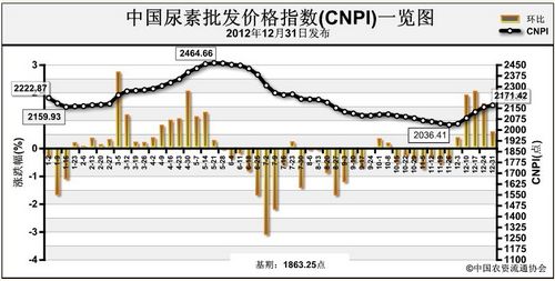 12月31日中国尿素批发价格指数(CNPI)为2171.42点环比上涨12.43点,涨幅为0.58%;同比下跌51.45点,跌幅为2.31%;比基期上涨308.17点,涨幅为16.54%;
