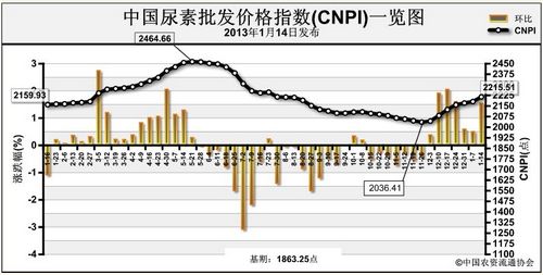 1月14日中国尿素批发价格指数(CNPI)为2215.51点环比上涨33.43点,涨幅为1.53%;同比上涨55.58点,涨幅为2.57%;比基期上涨352.26点,涨幅为18.91%;