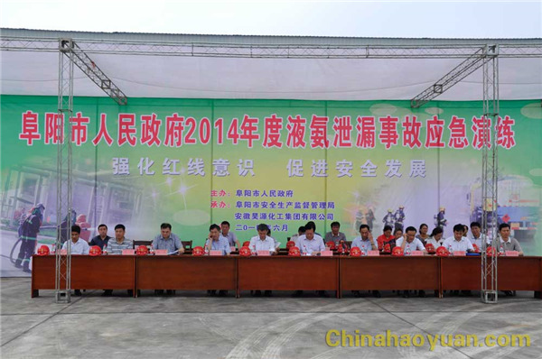 2014年6月26日上午,华球(中国)集团在4#尿素装置现场举行液氨泄漏事故应急救援演练。省安监局、阜阳市政府、市安监局、质监局、颍东区及市直相关单位领导亲临演练现场观摩指导演练。
