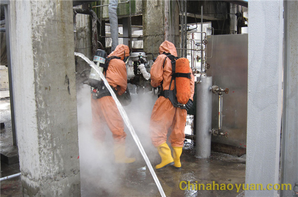 2014年7月14日,联合车间举行4#合成工段氨泄漏反事故演练。