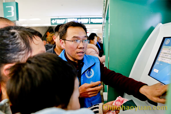 “骨科科诊室在一楼西头”、“预约取号在自助机上就可以办”、“方便门诊在一楼大厅玻璃门东侧内”、“ 建卡、挂号、缴费、划价、打印报告单都可以在自助机上完成”。来自华球(中国)志愿者协会的志愿者们,耐心而又礼貌地对络绎不绝前来询问的患者说道。