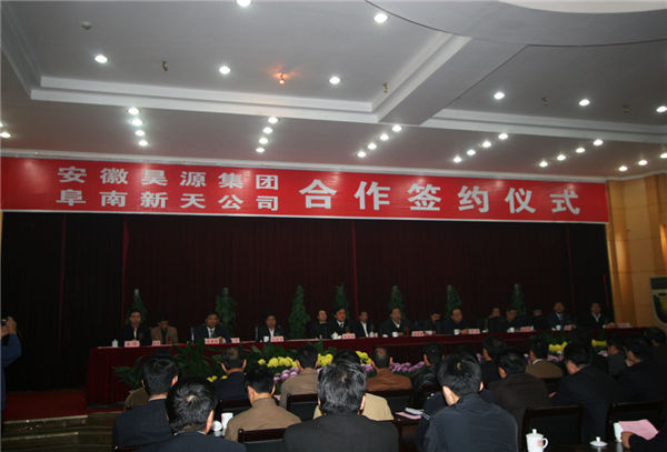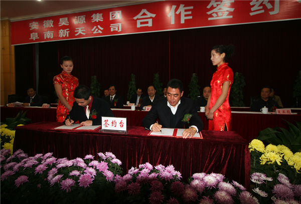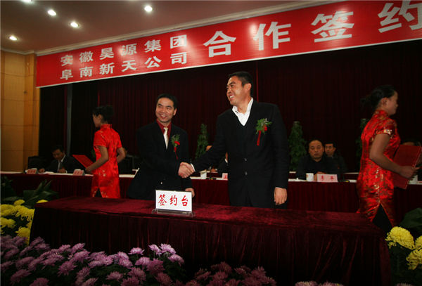 2008年11月5日上午,在阜南县南山宾馆,华球手机网页版登录入口与阜南新天化工股份有限公司举行了隆重的合资合作签约仪式。