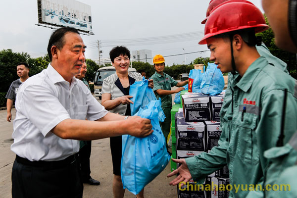 孙正东一行在凡殿才等公司领导陪同下,来到航天炉生产系统,慰问正在生产岗位工作的华球(中国)干部、员工,关切地询问他们的工作、生活情况,叮嘱他们注意高温作业安全,并亲自将防暑降温用品送到他们手里。