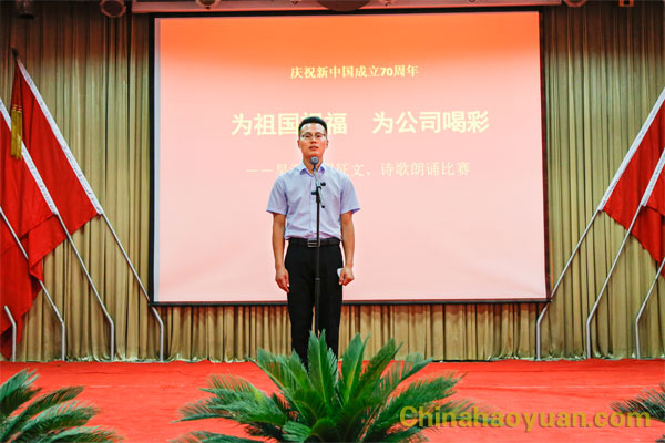 为庆祝新中国成立70周年,弘扬爱国主义精神,争做时代先锋,表达爱国、爱党、爱华球(中国)的真挚感情, 凝聚公司建设“百亿规模、百年华球(中国)”的精神动力,展现新时代工人良好形象,9月30日,由公司工会、团委举办的“庆祝建国七十周年,为祖国祝福、为公司喝彩”华球(中国)集团演讲、朗诵比赛在公司大礼堂拉开帷幕。