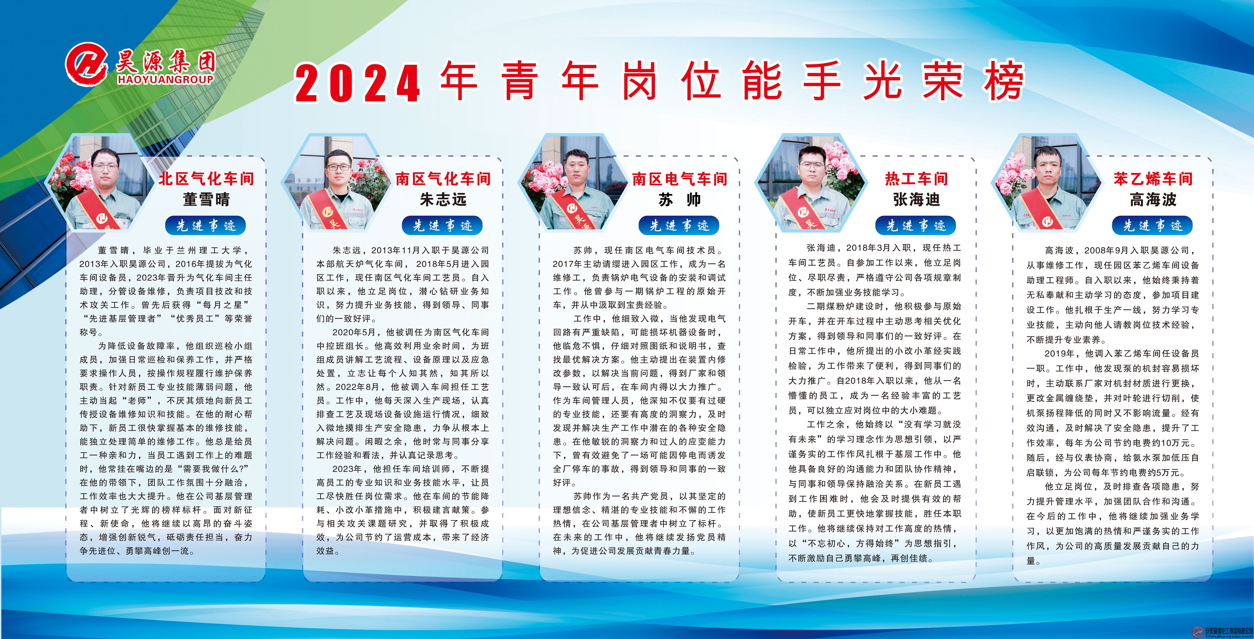 经过各单位民主推荐、活动评选小组综合评定和公示,依照公司青年岗位能手活动管理暂行办法,按照公平、公正、公开的要求,共评选出十名“青年岗位能手”,他们分别是:北区气化车间董雪晴、南区气化车间朱志远、南区电气车间苏帅、热工车间张海迪、苯乙烯车间高海波、南区净化车间陈涛、北区净化车间吴伟伟、聚酯车间张杨杨、天泉塑业许丁丁、总工办孟少林。
