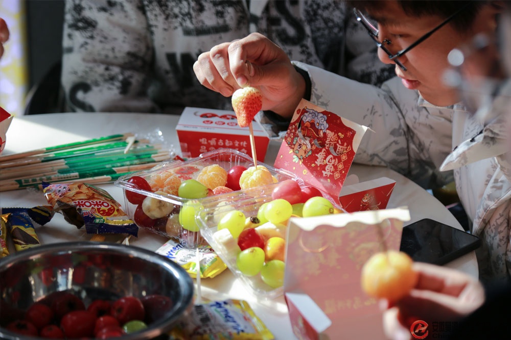 活动在一片欢声笑语中拉开序幕。青年员工齐聚一堂,分别围坐在5张小圆桌旁,动手和面、擀皮、包馅。不一会儿,排列整齐又形状各异的饺子制作完成。随后,活动现场还特别安排熬糖稀、制作糖葫芦环节,青年员工亲手将山楂、草莓、橘子等水果串成串,再裹上晶莹剔透的糖稀,制作出酸甜可口的糖葫芦。