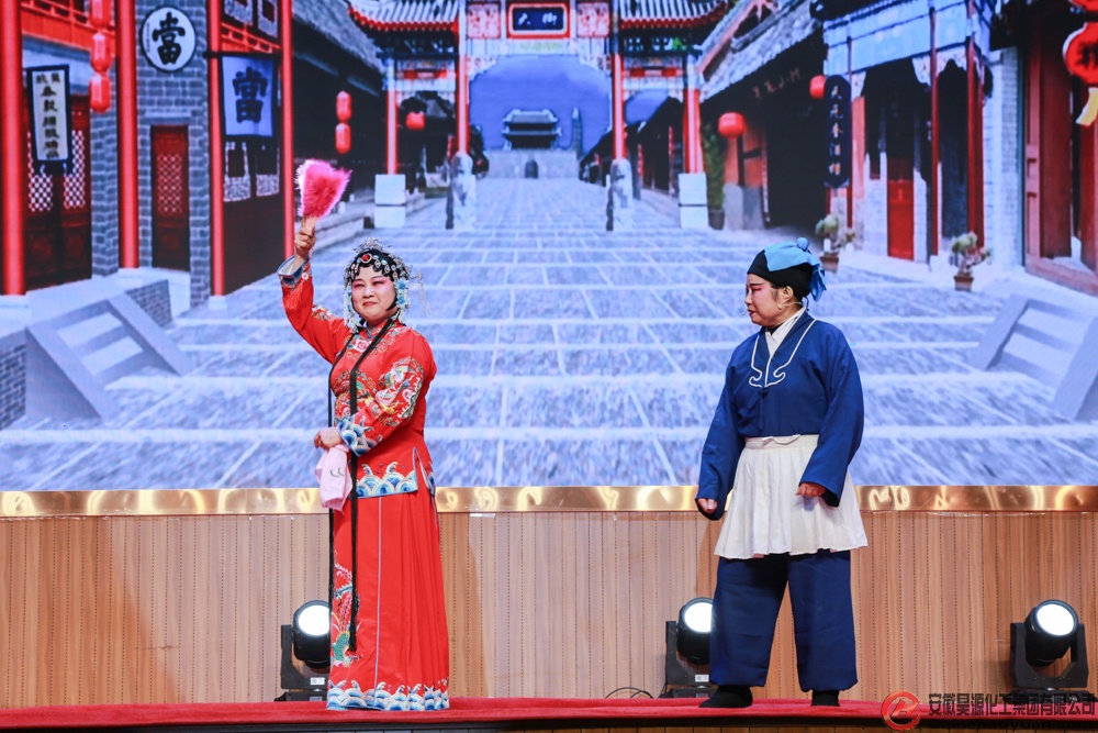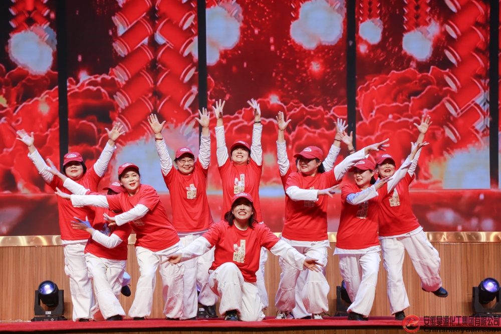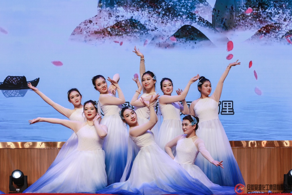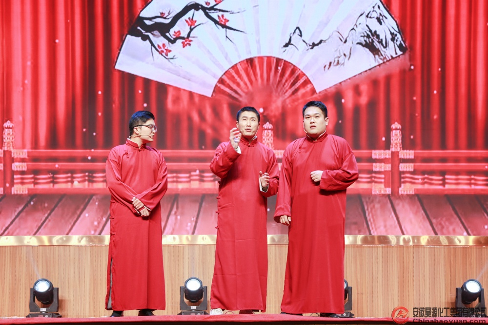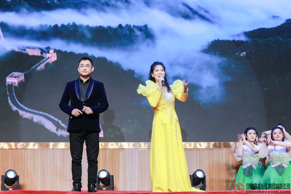 党委书记、董事长凡殿才等公司领导走上舞台,与演员握手,感谢演职人员为晚会辛苦付出,并与演职人员一起合影。