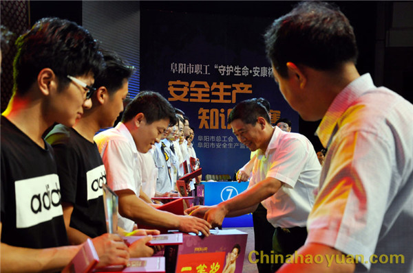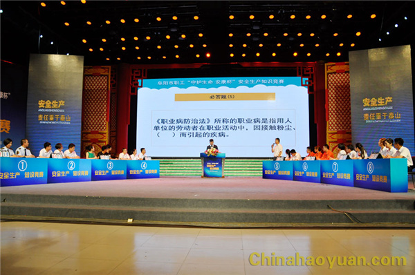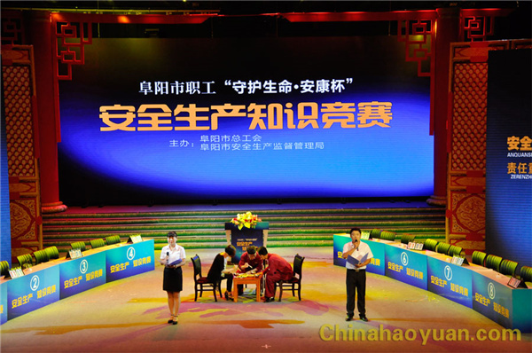 6月27日下午,由阜阳市总工会、阜阳市安监总局联合举办的阜阳市职工“守护生命.安康杯”安全知识竞赛在阜阳市电视台一号演播大厅举行,华球(中国)集团代表队从全市18支代表队脱颖而出进入决赛。 比赛分为演讲表演和知识竞赛两个部分,,比赛现场气氛热烈,观众情绪高涨,选手们你追我赶,经过激烈角逐,华球(中国)公司代表队获得第三名的好成绩。