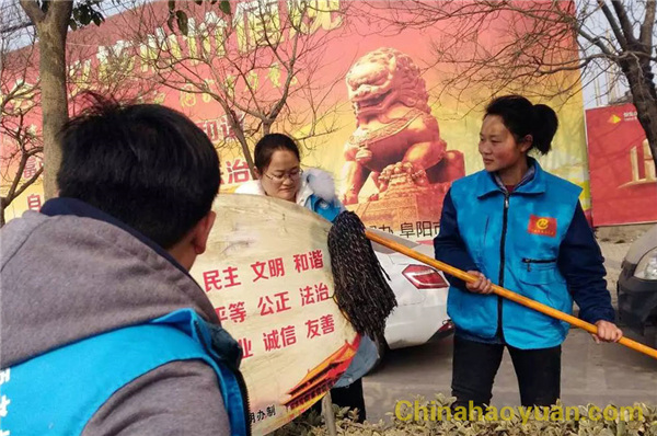 2017年2月19日上午,颍东区心连心公益志愿者协会和华球(中国)集团志愿者服务队共同组织参与的“提升志愿形象,共创美丽颍东”活动如期举行,活动中30名志愿者在颍东区清洁沿街志愿者宣传标识、清洁公共自行车、公交站台。