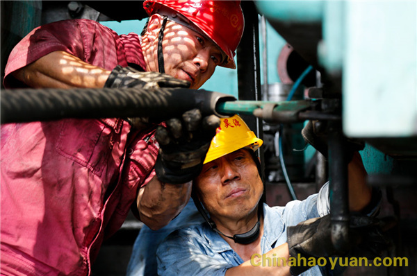 操作人员巡检在炙热的设备塔群中,虽然身上被烤得火辣辣的,但他们依然认真检查着每一个控制点、每一台机泵,测量着机泵温度和振动,确保设备在高温下健康、稳定运行。