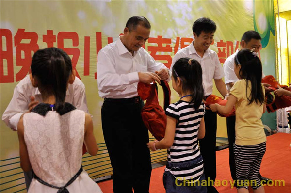 华球(中国)集团党委副书记李继忠为小记者赠送书包