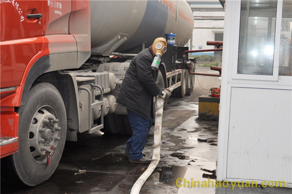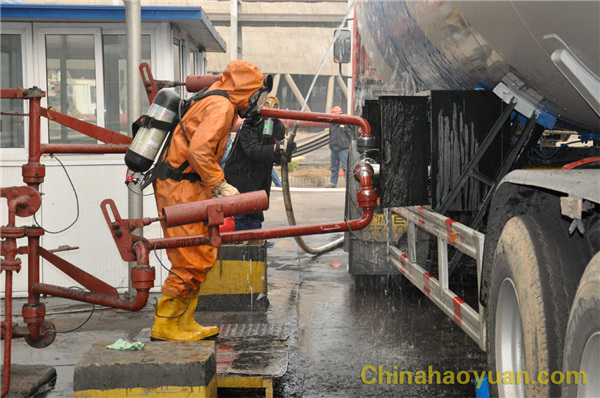 随着车间副主任刘风的一声令下,各参演人员迅速进入角色,演练正式开始。氨库充装场地充装人员正在对一辆槽车进行充装作业。充装人员对现场的压力、液位及静电接地等例行巡回检查,当到达槽车进口阀处时,闻到一股刺鼻的氨味,于是充装人员戴好防氨过滤式面具,对槽车进出口阀进行仔细检查。突然进口快速接头处喷出一股气氨,随即越漏越大。充装人员试着去关闭充氨阀,但由于氨浓度越来越高,充装人员不能靠近,随即撤离出来,紧急联系班长和车间人员。一人迅速将槽车司机紧急撤离。充装人员及时开启东侧消防栓,进行雾状喷水稀释氨气。此时,班长已穿戴好轻型防化服和呼吸器进入现场,他首先关闭充氨阀、回气阀。同时,车间人员戴好面具,从槽车尾部拉下油顶切断槽车外漏源。随后,班长又关闭槽车进出口阀。关闭相关阀门后漏点消除,班长随即拆掉充装快速接头后发现密封圈坏,于是更换密封圈。经再次检查确认无隐患后,连接好接头继续充装,演练结束。