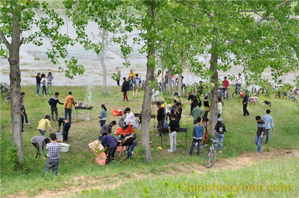 稍作休息,大家便开始了此次烧烤活动的准备工作,拾柴火、生炉子、串肉串,一片热火朝天的忙碌景象。