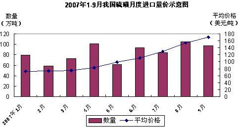 中国海关统计数据显示, 2007 年前 3 季度,我国共进口硫磺 753.6 万吨,价值 8.4 亿美元,比 2006 年同期分别增长 16% 和 56.4% 。